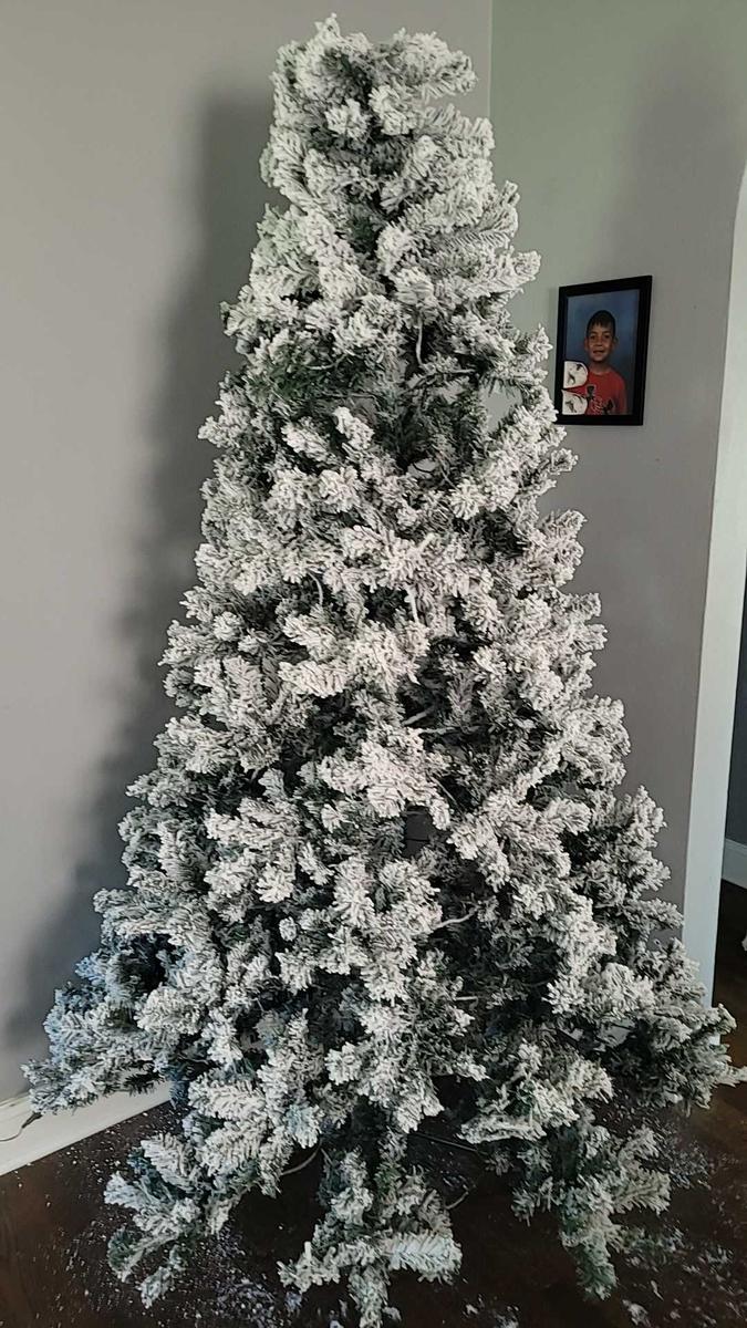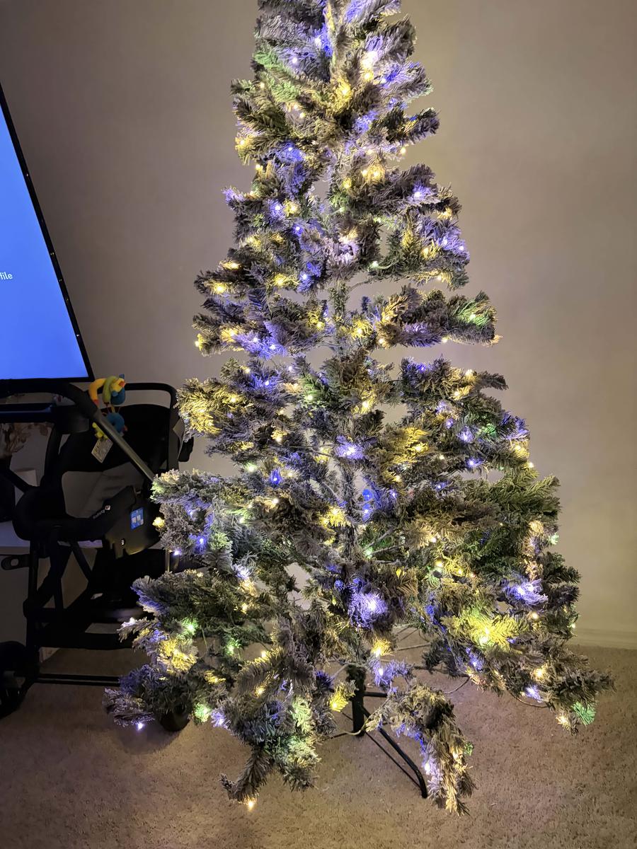 Lush 820-branch tree with warm pre-lit lights, snow-flocked realism, easy setup and storage, perfect for home or office holiday décor.